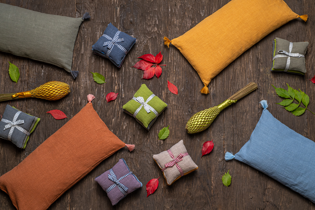 From this delicate combination emerge cushions, headbands, and scented sachets, available in nine warm and rich hues. A palette inspired by the colors of the season: the ochre of the hills, the brown of the earth, the green of the cypress trees, and the lavender blue of winter light.